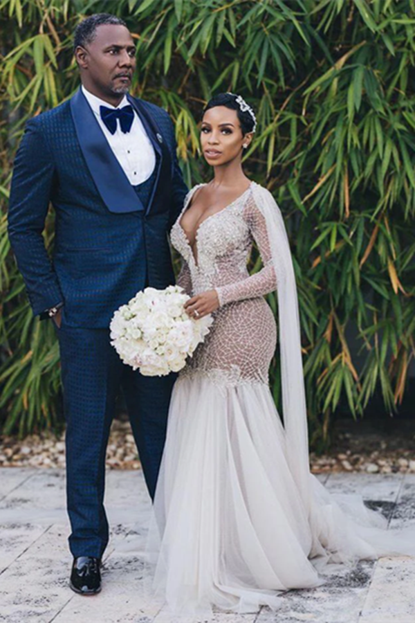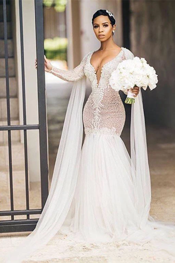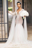 Promfast Sparkly Long Sleeves Wedding Dresses Romantic Beading Mermaid Bridal Gown Wedding Gown PFW0550