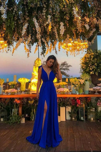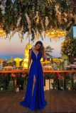 Promfast A-Line Deep V Neck Royal Blue High Split Long Prom Dresses, Cheap Evening Dresses PFM0009