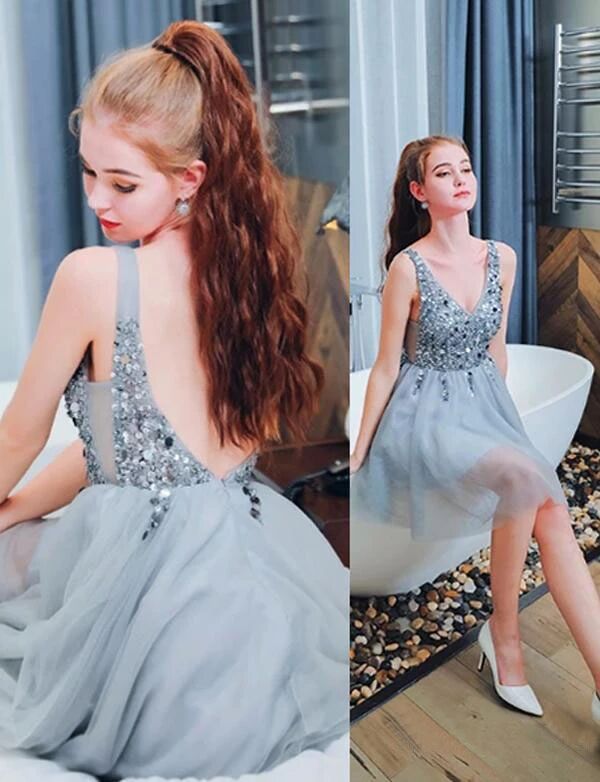 Bling A Line V Neck Light Blue Short Homecoming Dresses With Beading PFH0239
