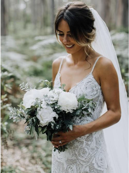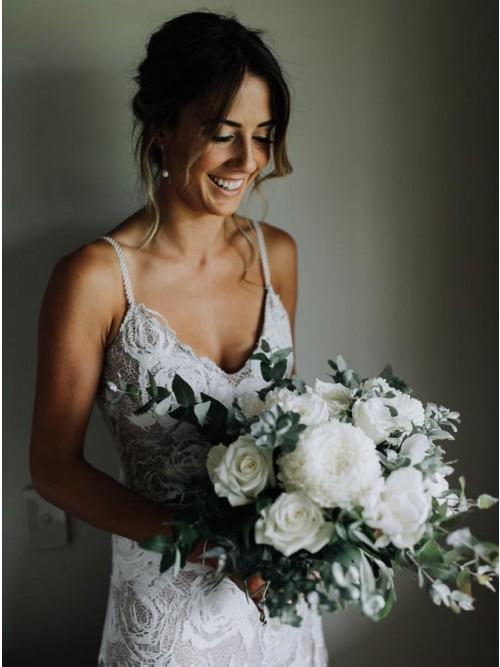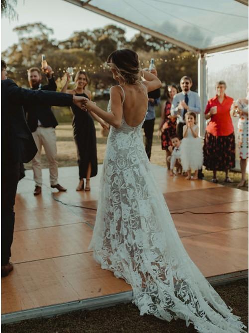 Sheath Spaghetti Straps Backless Beach Lace Wedding Dress PFW0343