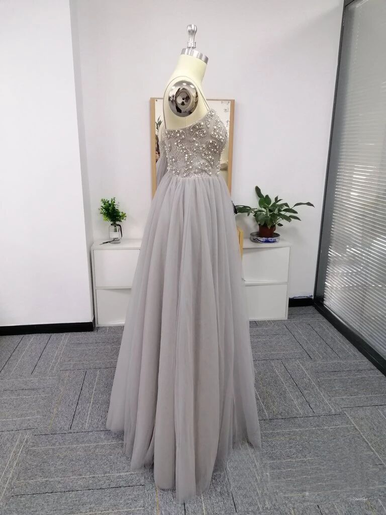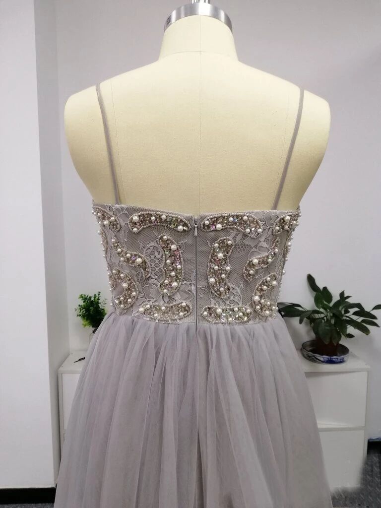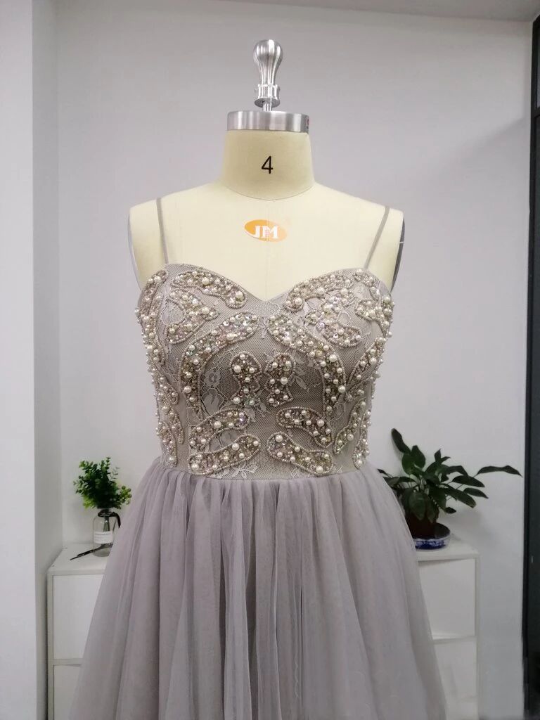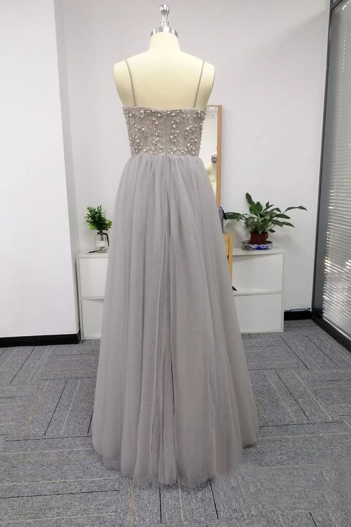 Silver Spaghetti Straps Beaded Bodice Tulle A Line Prom Dresses PFP1747