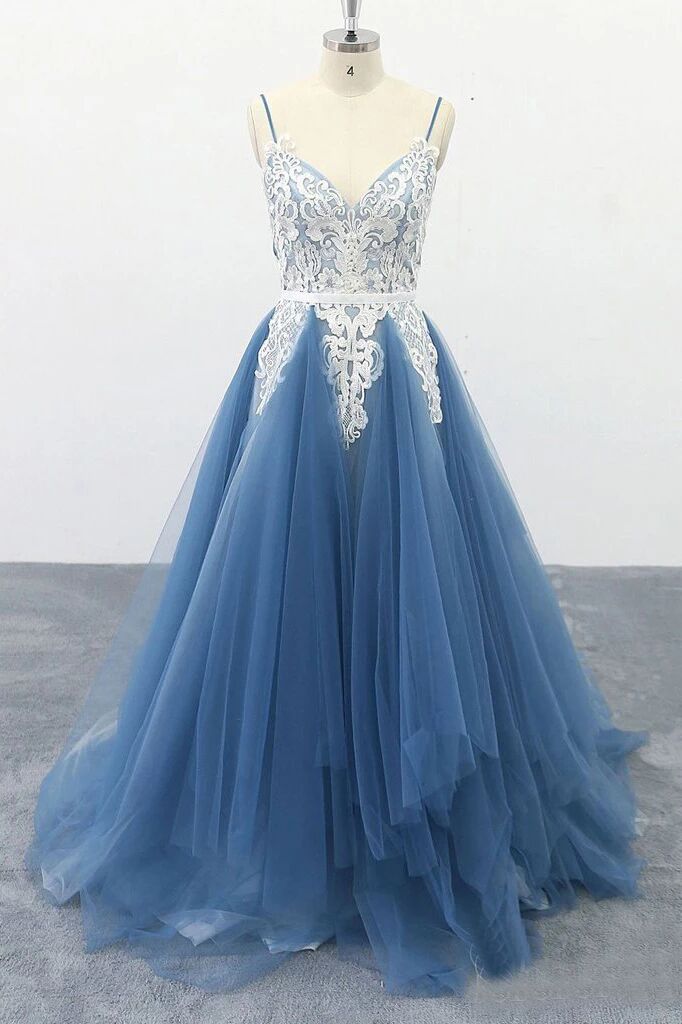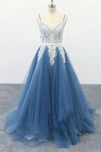 Spaghetti Straps A Line Party Dresses Appliques Blue Tulle Prom Dresses PFP1696