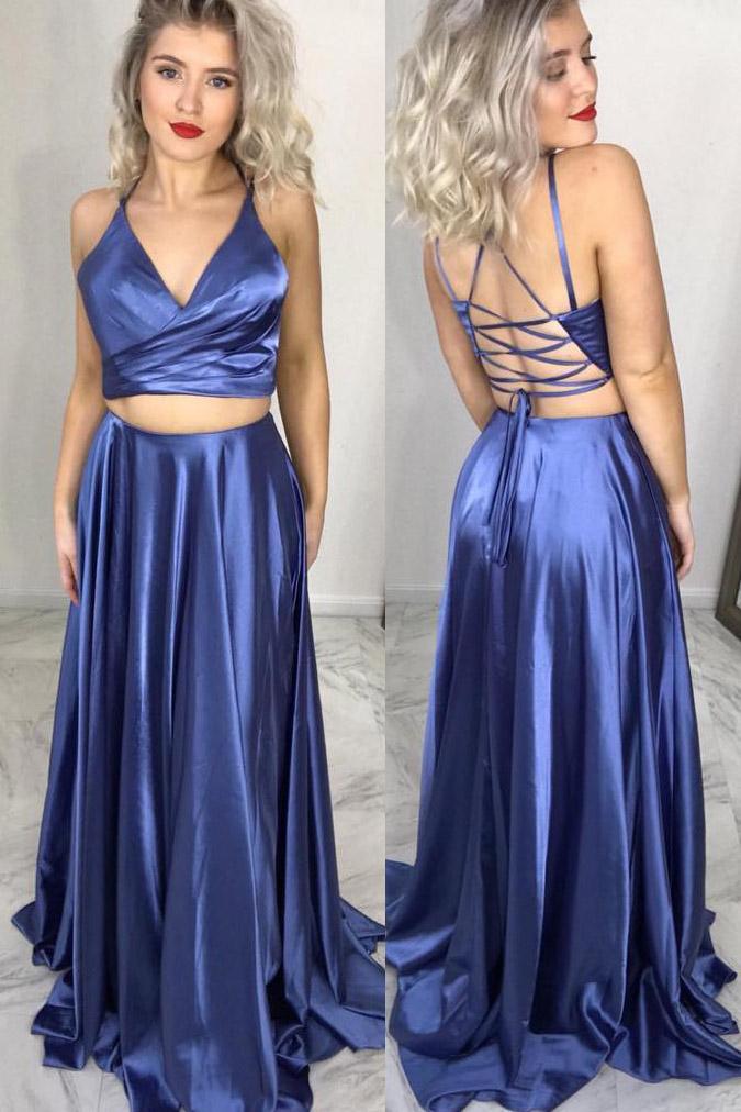Two Piece Lace Up Blue Long Prom Dress with Slit PFP1458