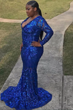Promfast Trendy Royal Blue V neck Long Sleeve Mermaid Plus Size Sequined Prom Dress PFP2181