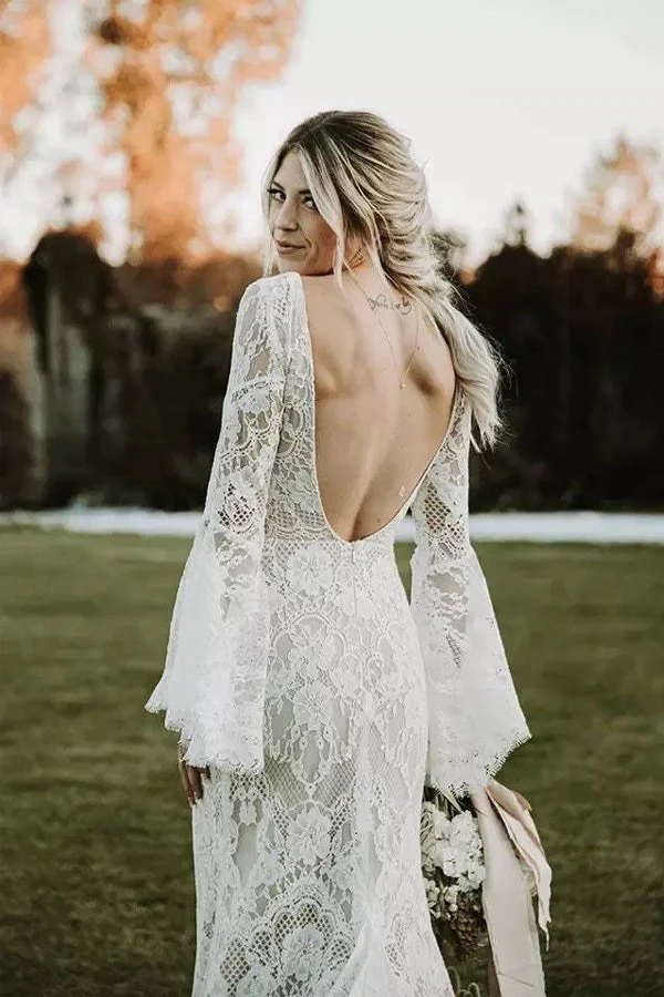 Lace Mermaid V Neck Long Sleeves Backless Bohemian Wedding Dresses PFW0645