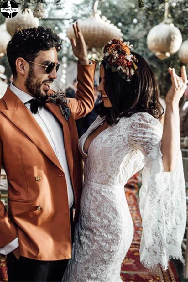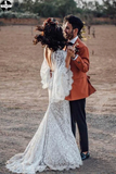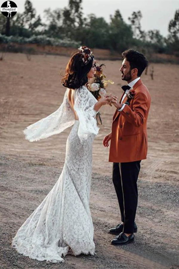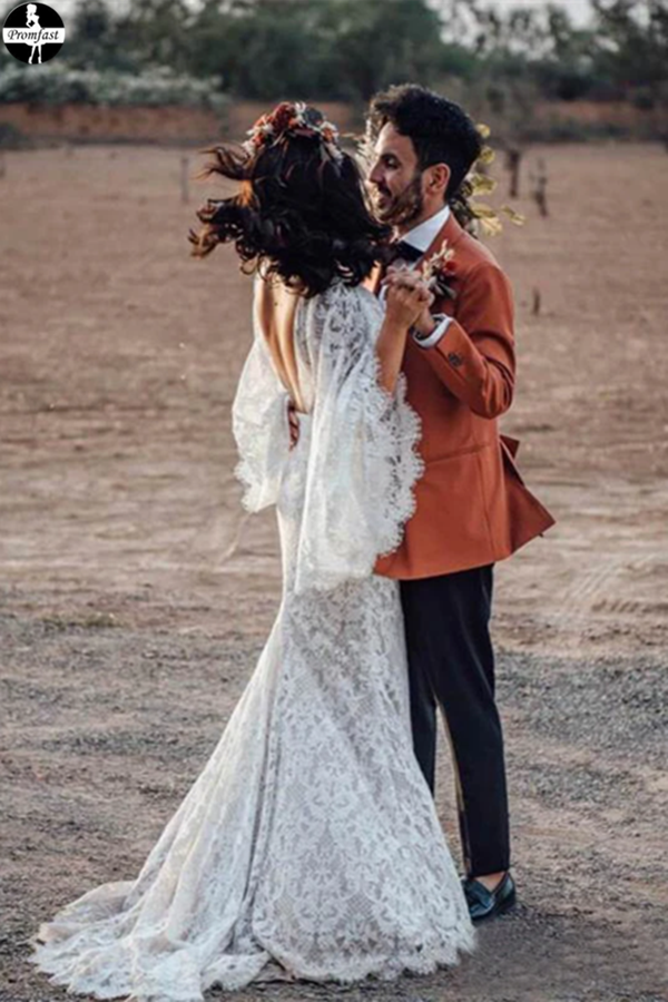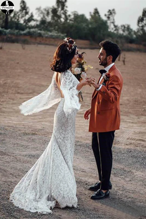 Promfast Backless Batwing Sleeve Boho Wedding Dresses Mermaid Rustic Wedding Dress PFW0525