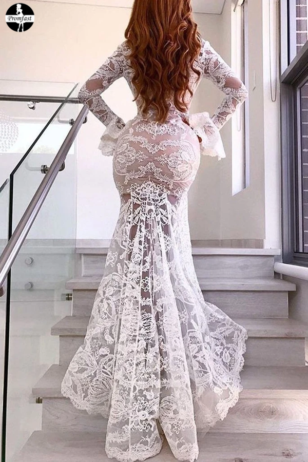 Promfast Long Sleeve Trumpet Mermaid Deep V Wedding Dress With Lace Sexy Wedding Dress PFW0503