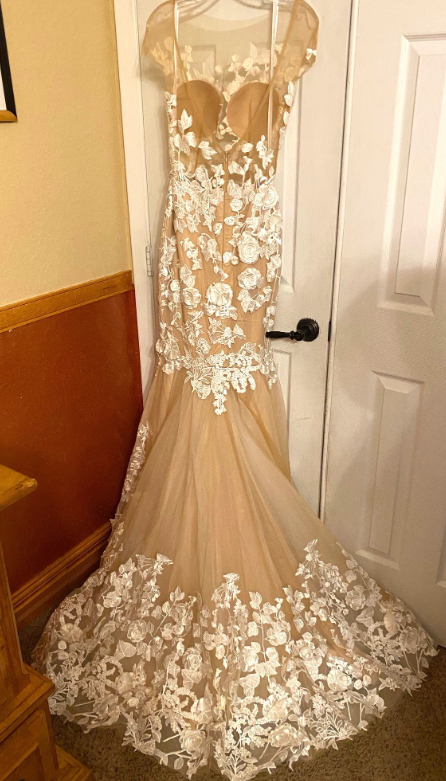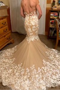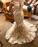 Scoop Neck Champagne Mermaid Wedding Dresses Sexy Open Back Lace Floral Applique Tulle Bridal Dress PFW0644