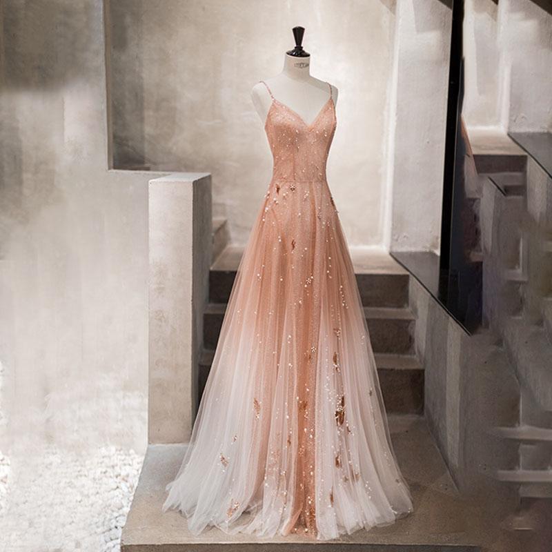 Ombre A Line Long Tulle Spaghetti Straps Prom Dresses With Beads PFP1439