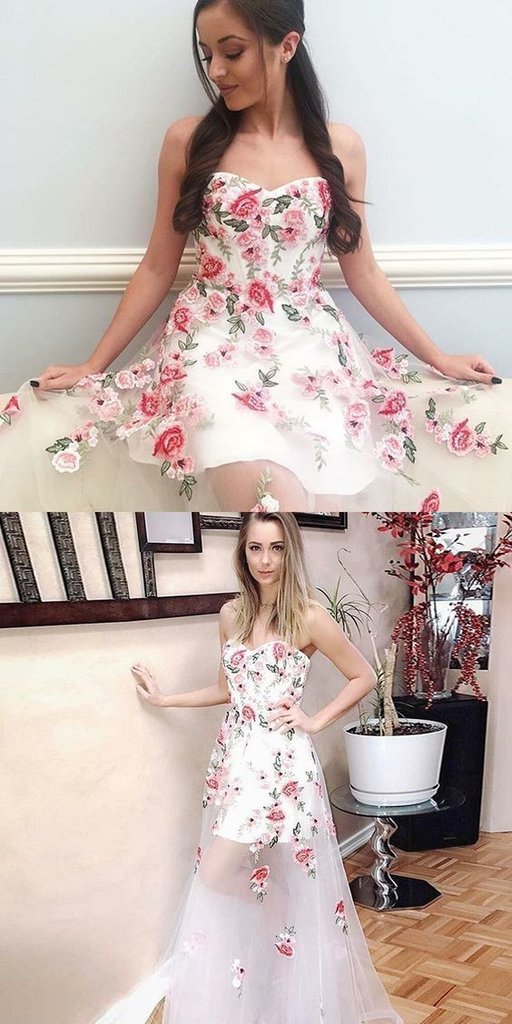 A-Line Sweetheart Long White Tulle Prom Dress with Floral Appliques PFP0052
