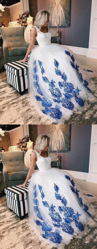 White Scoop Tulle Blue Lace Long Prom Dress, Evening Dress PFP0159