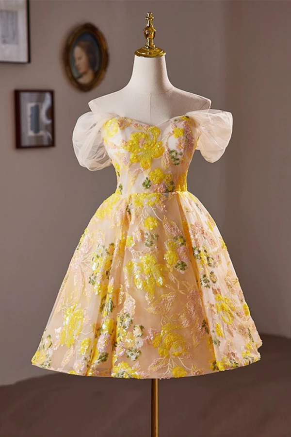 A Line Off Shoulder Tulle Lace Short Yellow Prom Dress, Yellow Homecoming Dress PFH0476