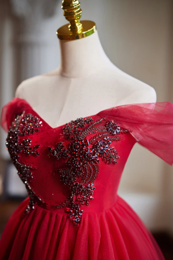 A Line Off Shoulder V Neck Tulle Burgundy Short Prom Dress with Beads PFH0475