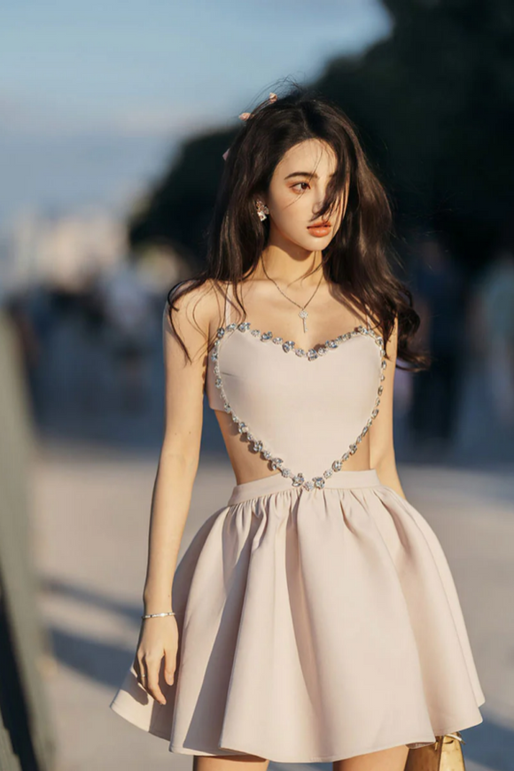 Cute Short Champagne Satin Straps Short Party Dress, Homecoming Dress PFH0550