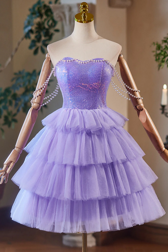 Lovely Tulle Pearl Short Prom Dress, A Line Strapless Evening Party Dress PFH0528
