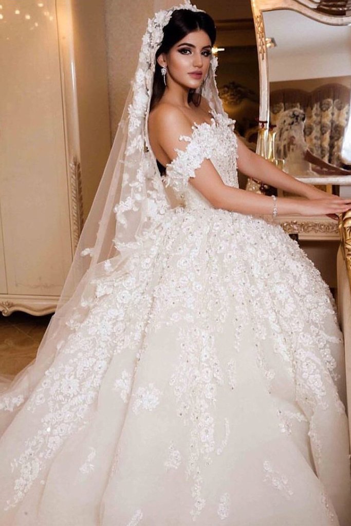 A Line Off The Shoulder Tulle Wedding Dresses With Lace Applique PFW0050