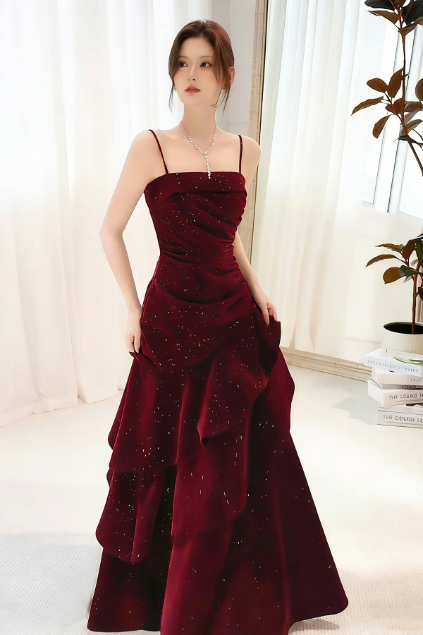 Sparkly Burgundy Velvet Evening Gown, Sleeveless Ruched Formal Dress PFP2916