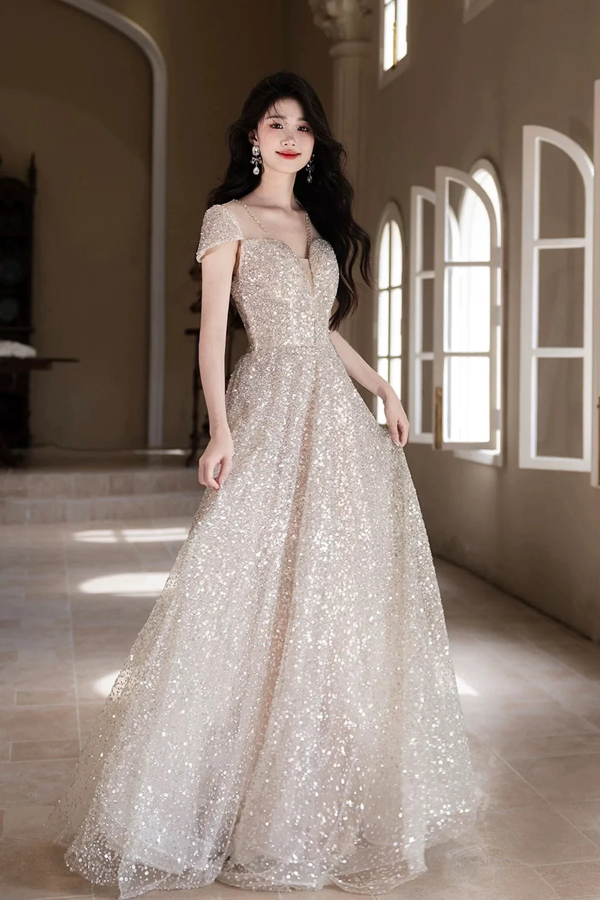 Champagne Sequin V Neck Sweetheart Formal Evening Prom Dress, Sparkle Ball Gown PFP2913