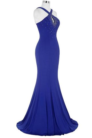 Royal Blue Open Back Long Mermaid Beaded Sexy Prom Dresses PFP1056