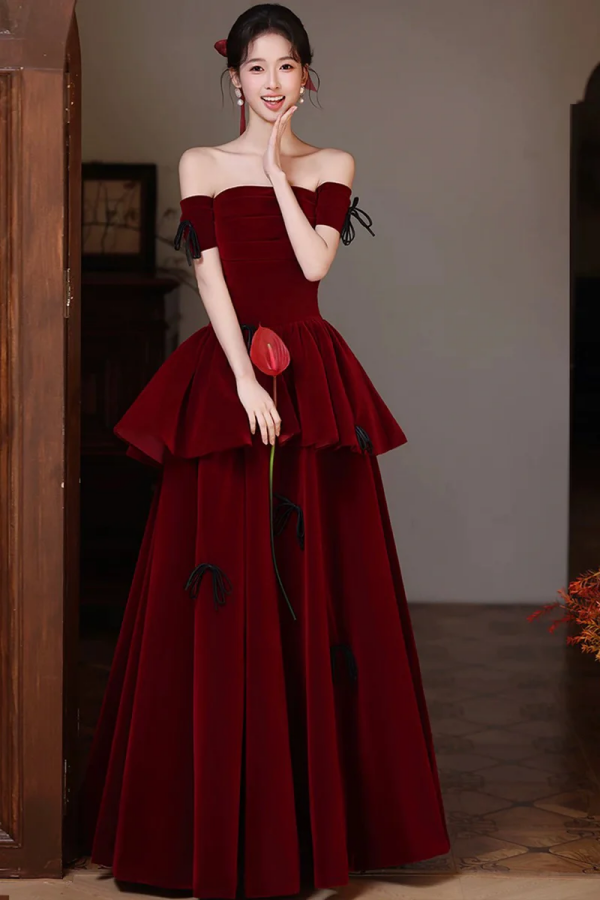 Burgundy Off Shoulder Velvet Ball Gown, A Line Tiered Ruffle Prom Dress PFP2912
