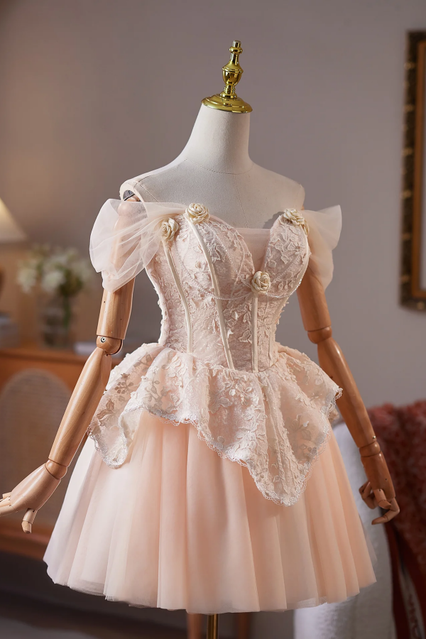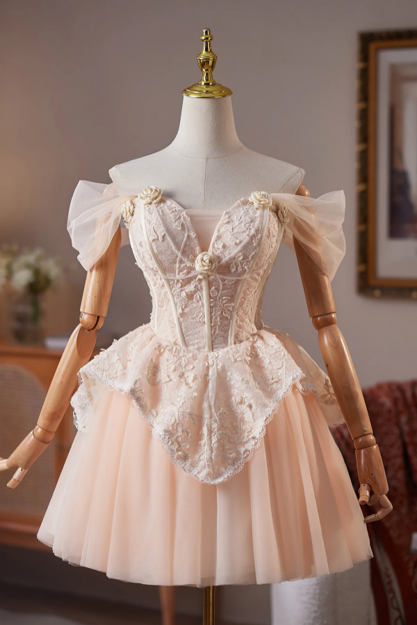 A Line Off Shoulder Tulle Lace Champagne Pink Short Prom Dress, Homecoming Dress PFH0545