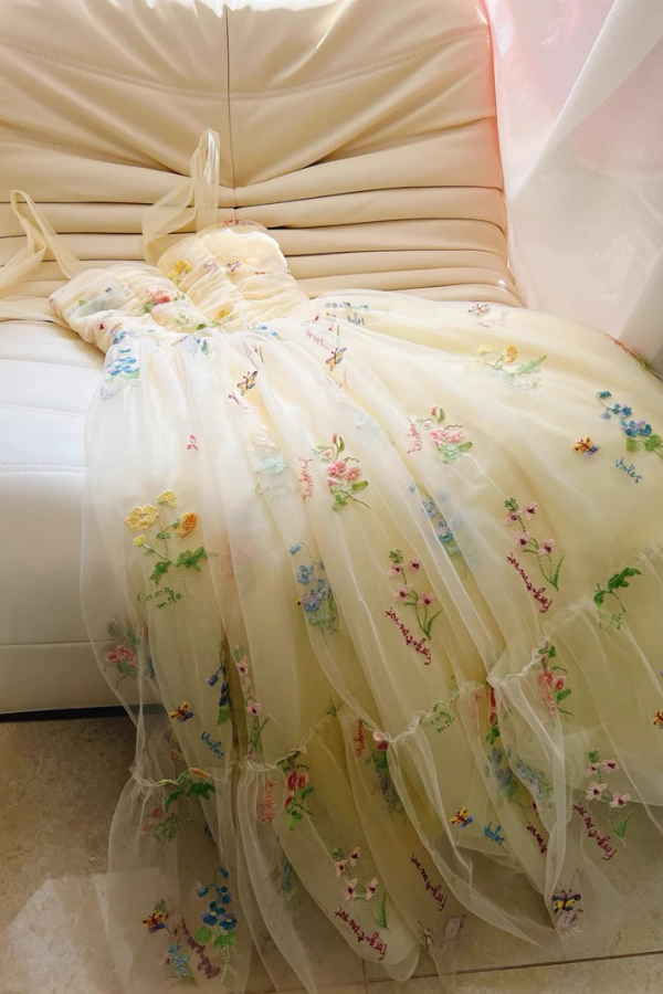 A Line Sweetheart Neck Tulle Lace Yellow Long Prom Dress, Formal Dress PFP2867