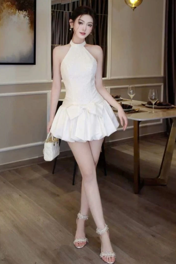 A Line White Halter Short Prom Dress, Birthday Party Homecoming Dress PFH0551
