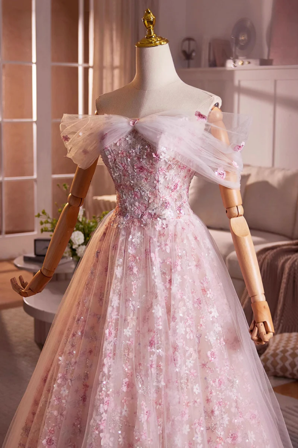Beautiful Pink Beading Appliques Prom Dress, A Line Off the Shoulder Evening Dress PFP2863