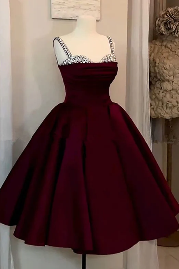 Wine Red Satin Beaded Straps Knee Length Party Dress, Homecoming Dress PFH0543