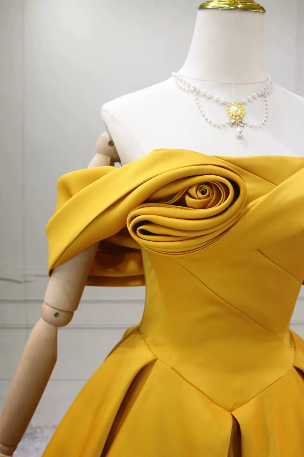 A Line Off Shoulder Satin Yellow Long Prom Dress, Formal Dress PFP2905