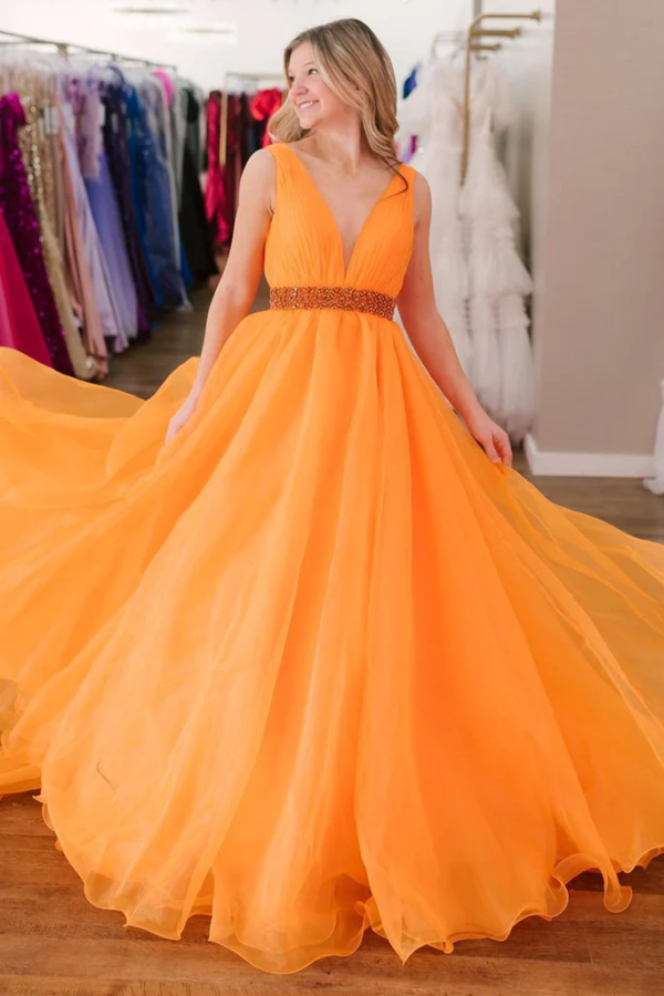 A Line V Neck Red/Blue/Orange Long Prom Dress with Beaded Belt PFP2378