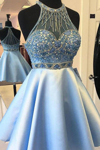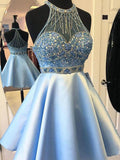 A-Line Blue Satin Sleeveless Beaded Short Homecoming Dresses PFH0022