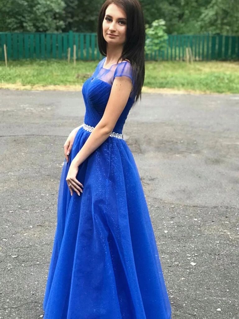 A-line Cap Sleeves Royal Blue Long Prom Dresses Beaded Evening Dresses PFP1669