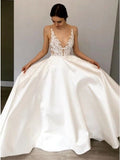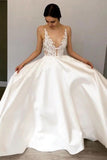 A-Line Deep V-Neck Floor-Length Satin Wedding Dress with Lace Appliques PFW0428