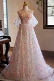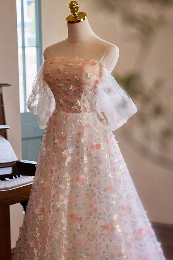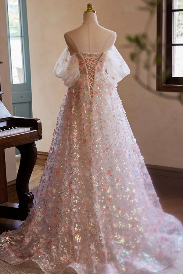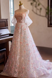 A Line Off Shoulder Lace Tulle Pink Long Prom Dress, Pink Long Evening Dress PFP2635
