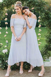 A-Line Off-the-Shoulder Short Sleeve Pleated Chiffon Bridesmaid Dress with Lace PFB0101