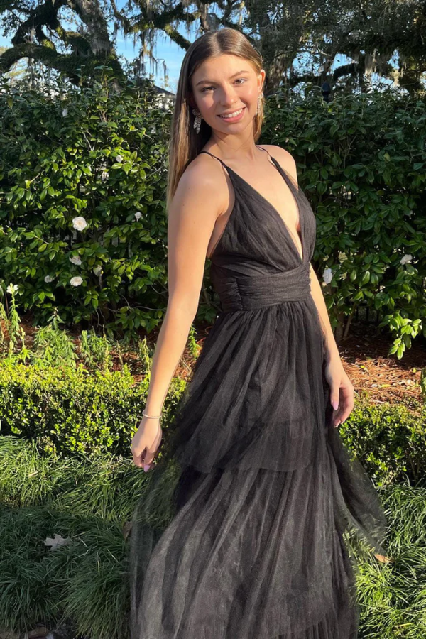 A Line V Neck Black Tulle Layered Long Prom Dress, V Neck Black Formal Dress PFP2377