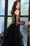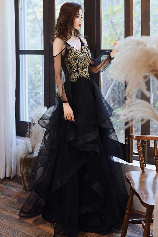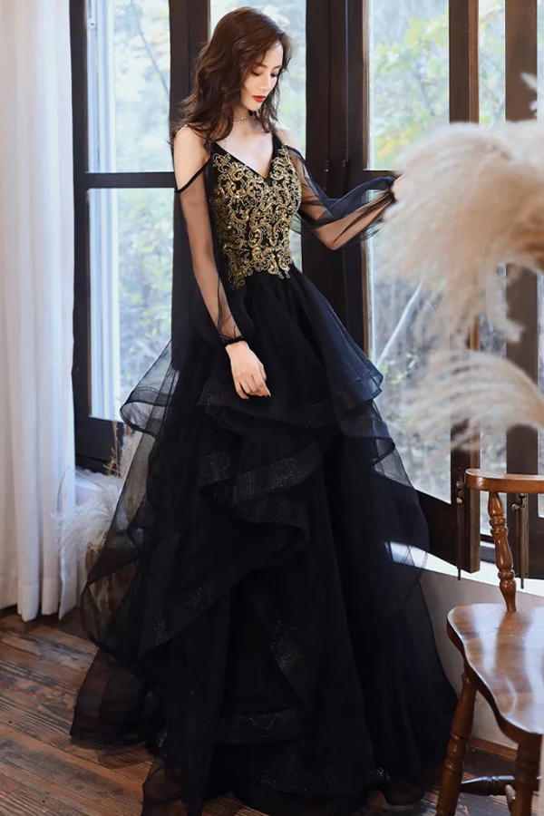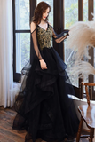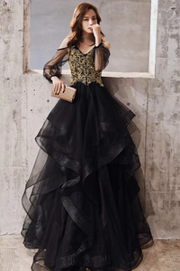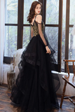 A Line V Neck Tulle Beads Black Long Prom Dress, Black Long Formal Dress PFP2604