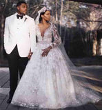 Ball Gown Deep V-Neck Long Sleeves Ivory Wedding Dress with Lace Appliques PFW0035