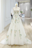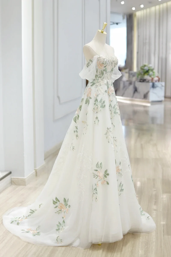 Beautiful Floral Lace Tulle Long Prom Dress, White Off the Shoulder Evening Party Dress PFP2512