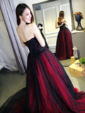 Burgundy Lace Tulle A Line Strapless Long Prom Dress PFP0327