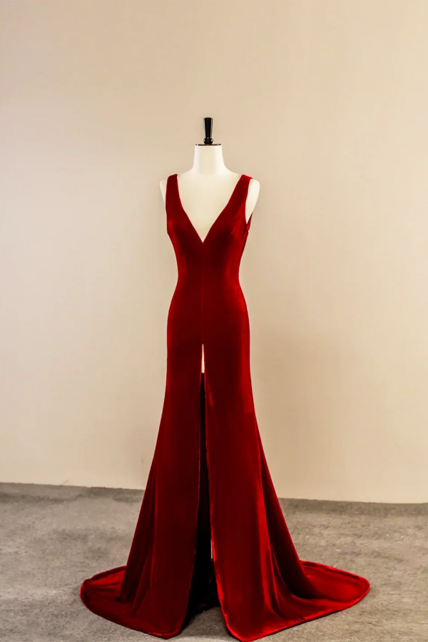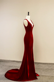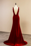 Burgundy V Neck Velvet Long Prom Dress, Simple Mermaid Backless Evening Dress PFP2577