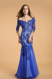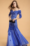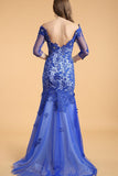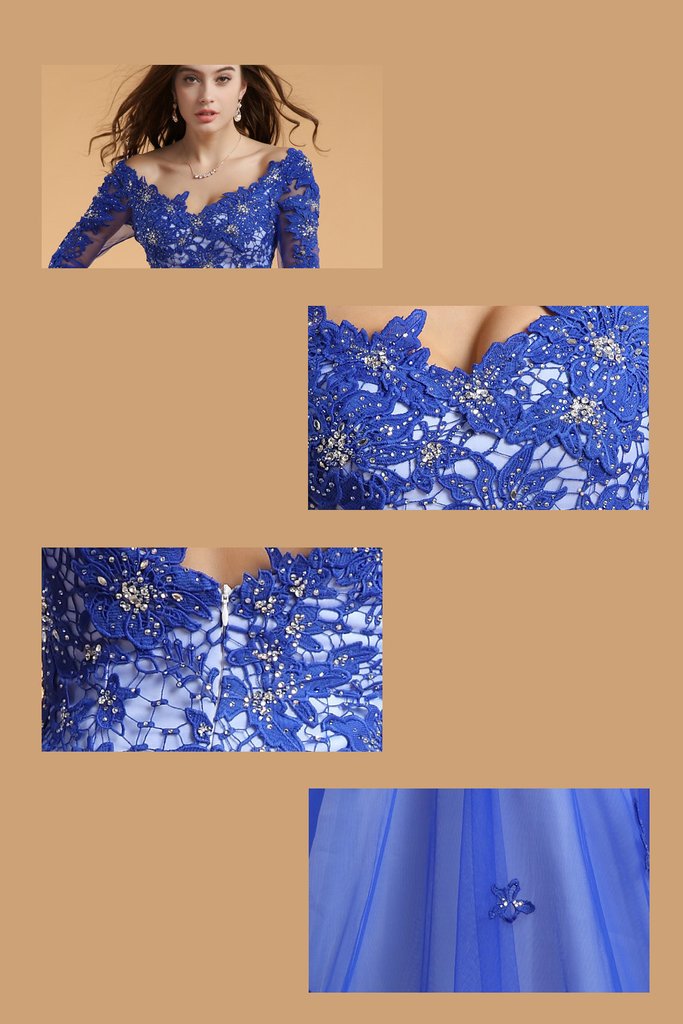 Lace V-neck Blue Half Sleeves Backless Long Prom Dresses PFP1305