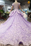 Lilac Short Sleeves Lace Up Back Appliques Tulle Princess Prom Dresses PFP1387