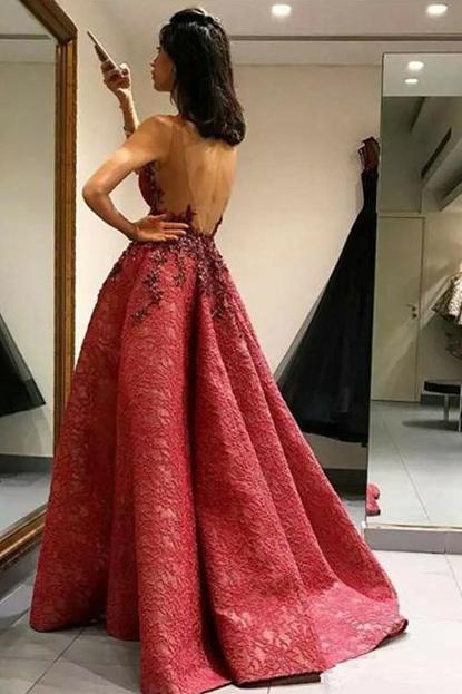 Modest A-Line Round Neck Backless Sweep Train Lace Prom Dress with Appliques PFP0313