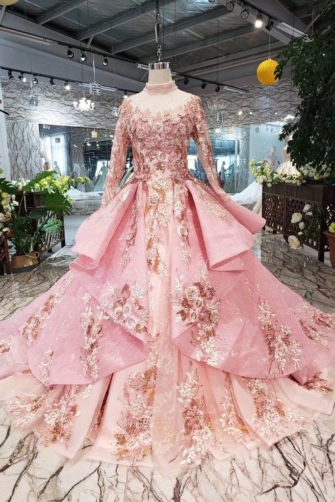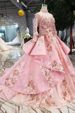 New Arrival Pink Prom Dresses Long Sleeves Ball Gown High Neck Quinceanera PFP0549