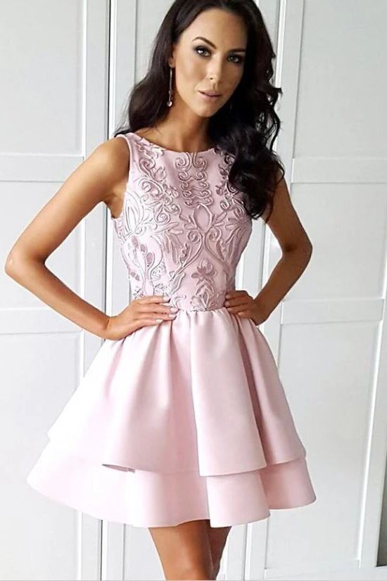 Pretty Bateau Short Pink Satin Homecoming Party Dresses with Appliques PFH0243