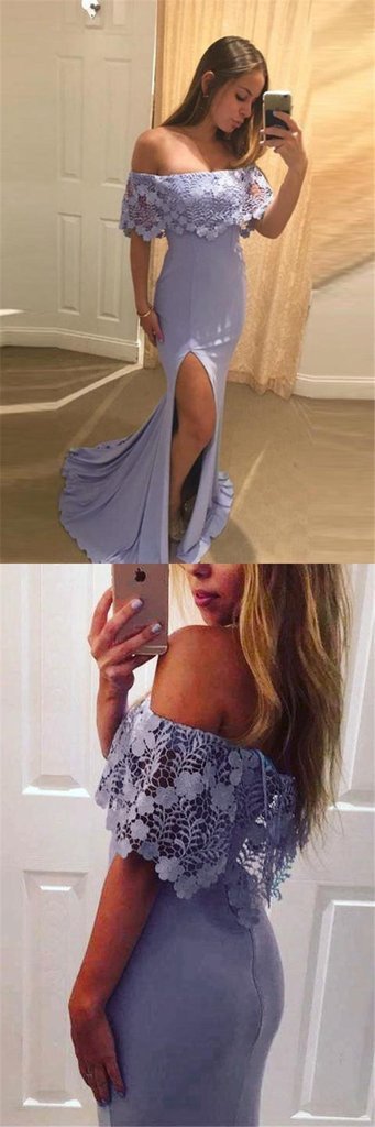 Pretty Lavender Off Shoulder With Lace Split Mermaid Prom Dresses PFP0102