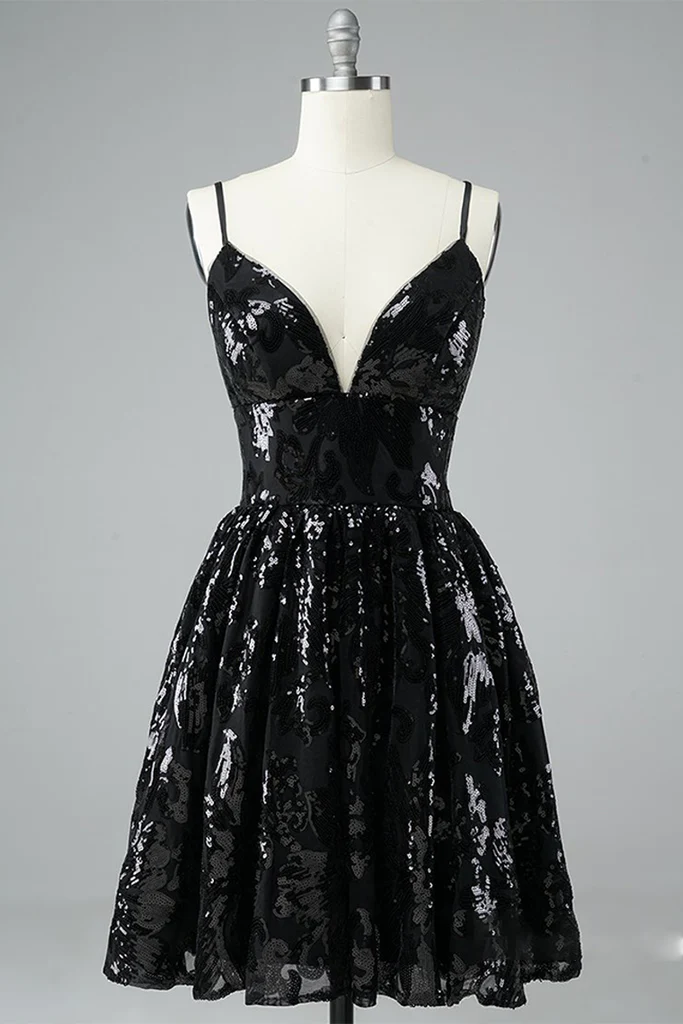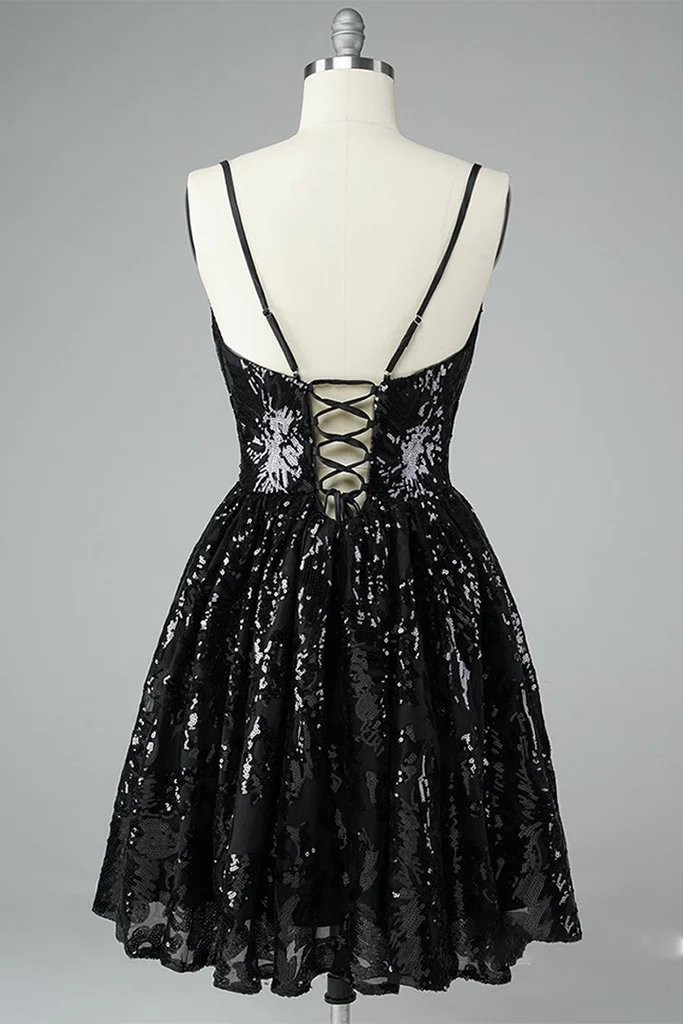 Promfast A Line Black Lace Ruffles Spaghetti Straps V Neck Short Mini Homecoming Dresses PFH0392