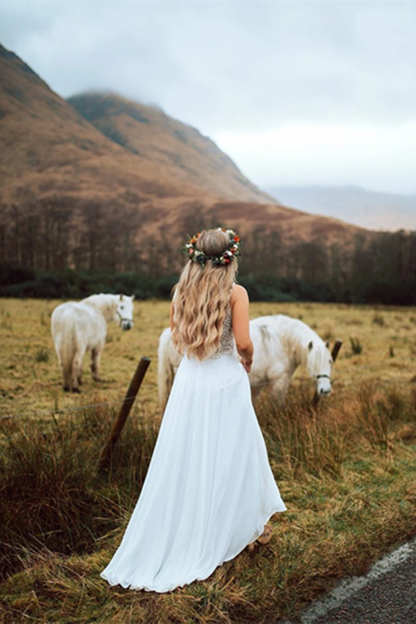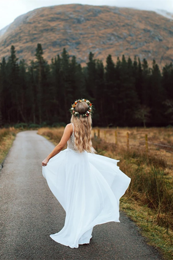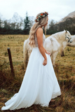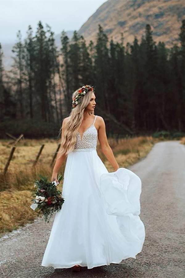 Promfast A line Spaghetti Straps White Beach Wedding Dress Beading Wedding Gowns PFW0549